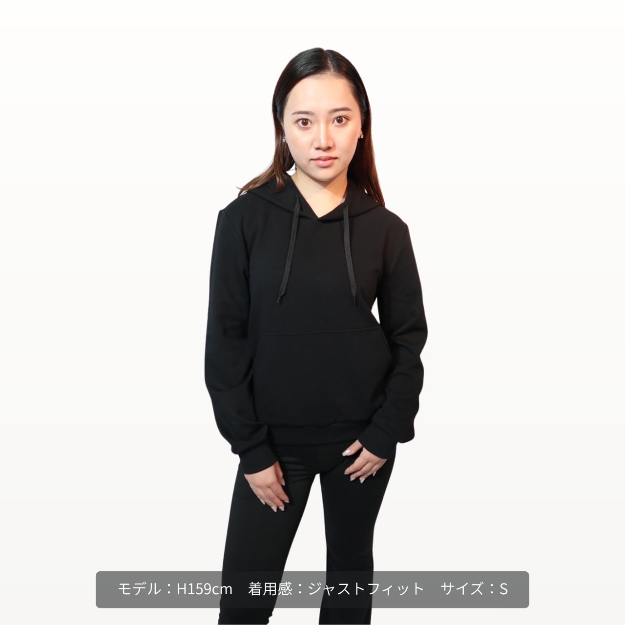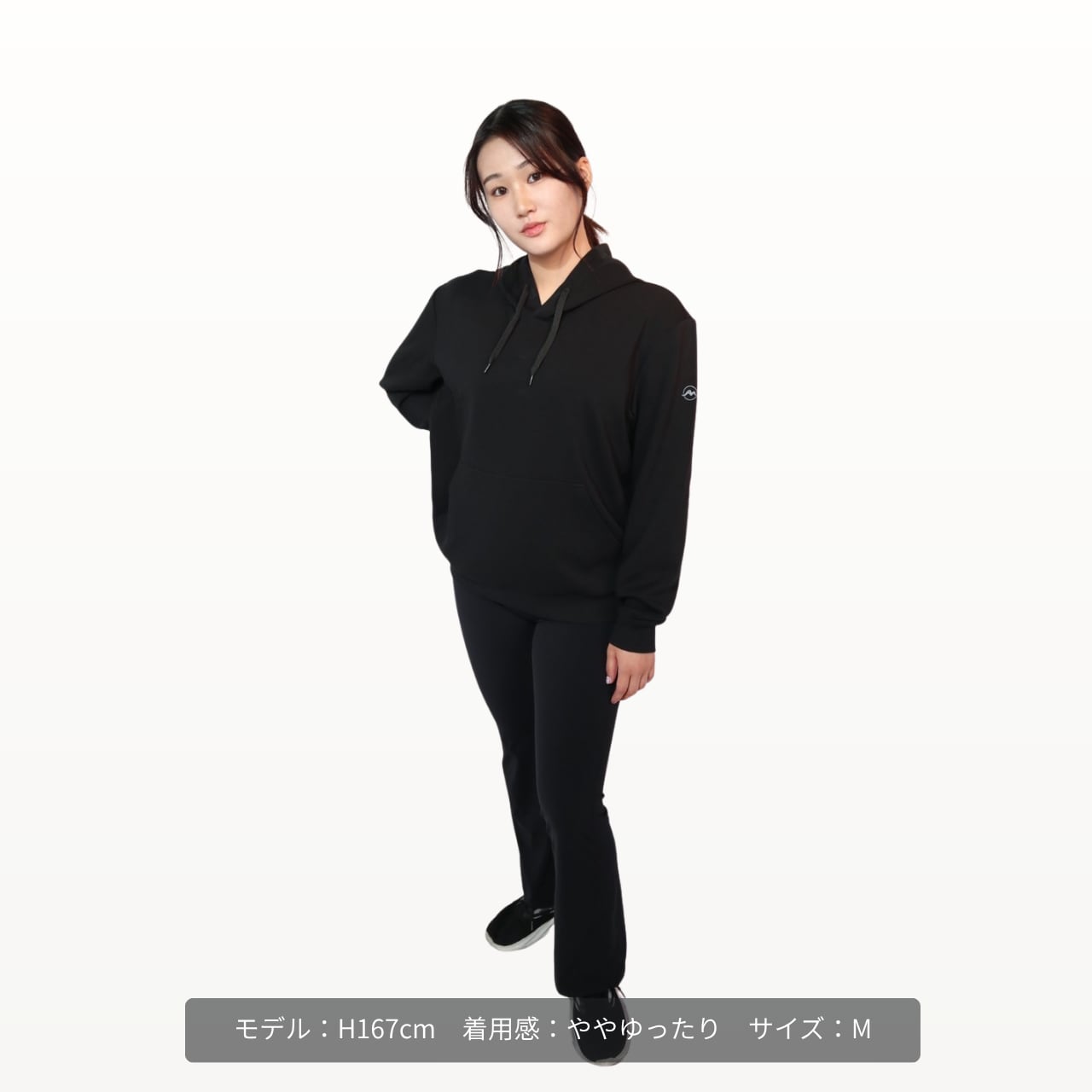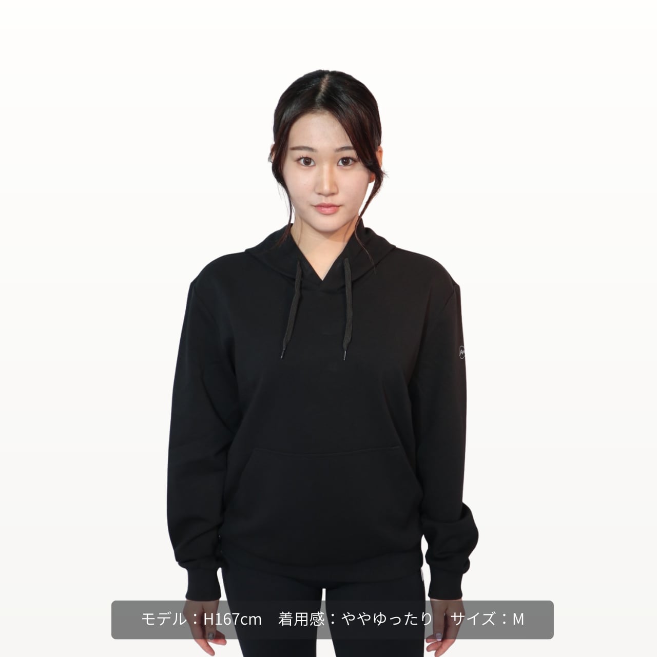 前面に定番のカンガルーポケットを配置。スマホや鍵などの小物を入れられるほか、外出時に手を入れて体を温めたいときにも便利です。
