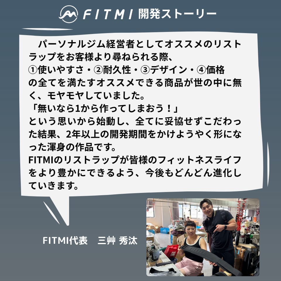 FITMIのリストラップ(WRIST WRAPS)は、シンプルな商品ですが、年間1,500セッションのパーソナルトレーニングを行う弊社代表三艸(ミクサ)の、こだわりポイントが詰まった商品です!